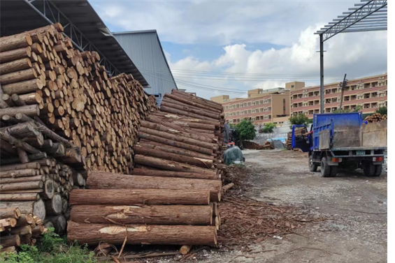 为进一步了解市场,记者在上述木材加工商的建议下,又来到规模更集中的广州杨屋木材市场,相比之下,杨屋市场占地面积和商户数量明显较多。此市场主要用的原木为桉木,来源于本地,加工后的木方等产品用于房屋建筑承重部分或家具制造。