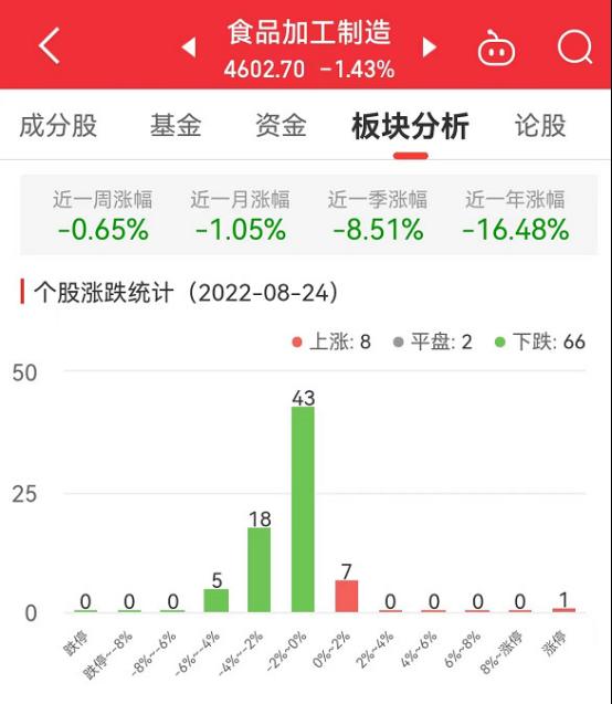 中国经济网北京8月24日讯 今日,食品加工制造板块整体跌幅1.43%,其中,8只股票上涨,2只股票平盘,66只股票下跌。