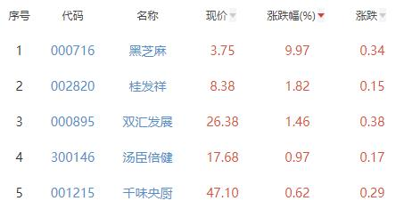 其中,黑芝麻(000716)、桂发祥(002820)、双汇发展(000895)、汤臣倍健(300146)、千味央厨位列板块涨幅前五位,涨幅分别为9.97%、1.82%、1.46%、0.97%、0.62%。