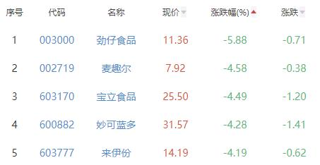 劲仔食品、麦趣尔(002719)、宝立食品、妙可蓝多(600882)、来伊份(603777)位列涨幅榜后五位,涨幅分别为-5.88%、-4.58%、-4.49%、-4.28%、-4.19%。