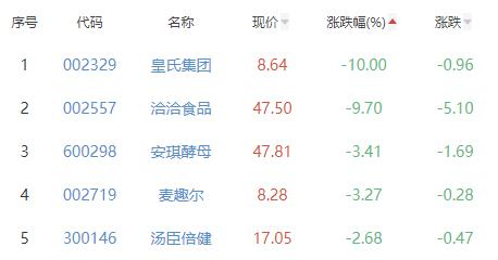 皇氏集团、恰恰食品、安琪酵母(600298)、麦趣尔(002719)、汤臣倍健(300146)位列涨幅榜后五位,涨幅分别为-10.00%、-9.70%、-3.41%、-3.27%、-2.68%。