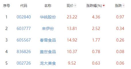 其中,华统股份(002840)、来伊份(603777)、春雪食品、盖世食品、龙大美食位列板块涨幅前五位,涨幅分别为4.36%、2.52%、1.77%、0.78%、0.63%。