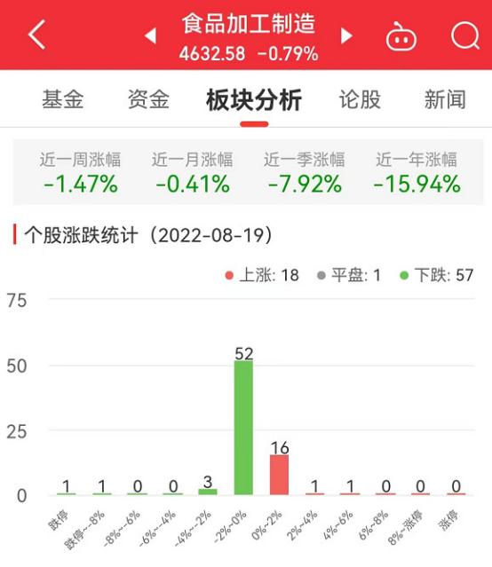 中国经济网北京8月19日讯 今日,食品加工制造板块整体跌幅0.79%,其中,18只股票上涨,1只股票平盘,57只股票下跌。
