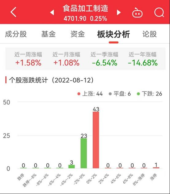 中国经济网北京8月12日讯 今日,食品加工制造板块整体涨幅0.25%,其中,44只股票上涨,6只股票平盘,26只股票下跌。