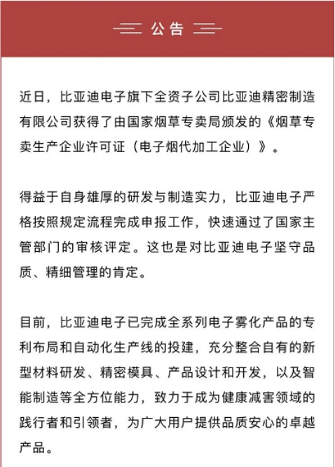 8月4日,比亚迪(002594)电子官方公众号消息称,比亚迪电子旗下全资子公司比亚迪精密制造有限公司获得了由国家烟草专卖局颁发的《烟草专卖生产企业许可证(电子烟代加工企业)》。这意味着比亚迪电子在电子烟代工领域正式以合法身份参与竞争。