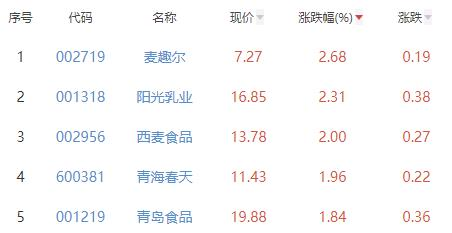 其中,麦趣尔(002719)、阳光乳业、西麦食品(002956)、青海春天(600381)、青岛食品位列板块涨幅前五位,涨幅分别为2.68%、2.31%、2.00%、1.96%、1.84%。