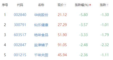 华统股份、仙乐健康、绝味食品(603517)、盐津铺子(002847)、千味央厨位列涨幅榜后五位,涨幅分别为-5.80%、-3.57%、-3.33%、-2.48%、-2.36%。
