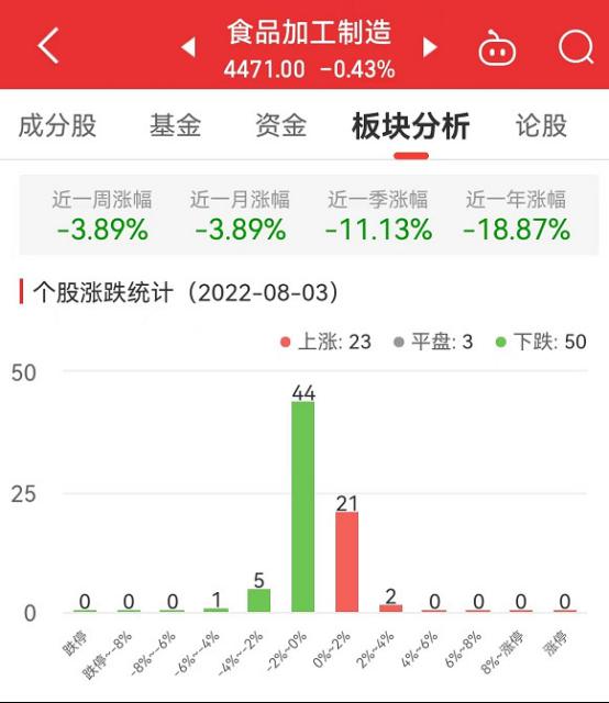 中国经济网北京8月3日讯 今日,食品加工制造板块整体跌幅0.43%,其中,23只股票上涨,3只股票平盘,50只股票下跌。