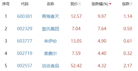 其中,青海春天(600381)、皇氏集团(002329)、来伊份(603777)、麦趣尔(002719)、洽洽食品(002557)位列板块涨幅前五位,涨幅分别为9.97%、7.64%、4.90%、4.40%、4.32%。
