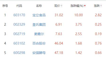 其中,宝立食品、皇氏集团(002329)、麦趣尔(002719)、百合股份、安琪酵母(600298)位列板块涨幅前五位,涨幅分别为10.00%、3.75%、2.55%、1.68%、1.42%。