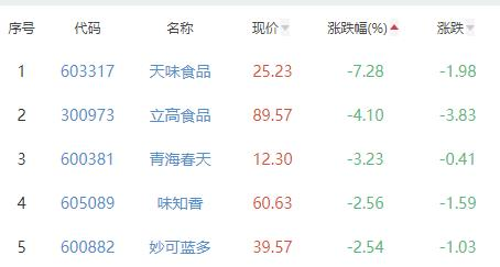 天味食品、立高食品、青海春天(600381)、味知香、妙可蓝多(600882)位列涨幅榜后五位,涨幅分别为-7.28%、-4.10%、-3.23%、-2.56%、-2.54%。