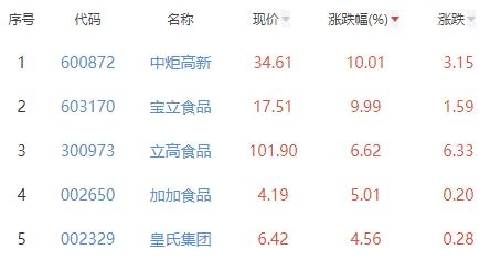 其中,中炬高新(600872)、宝立食品、立高食品、加加食品(002650)、皇氏集团(002329)位列板块涨幅前五位,涨幅分别为10.01%、9.99%、6.62%、5.01%、4.56%。