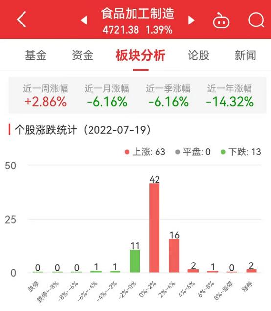中国经济网北京7月19日讯 今日,食品加工制造板块整体涨幅1.39%,其中,63只股票上涨,13只股票下跌。