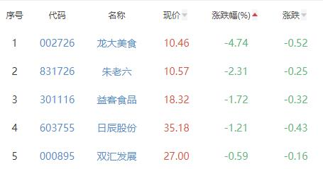 龙大美食、朱老六、益客食品、日辰股份(603755)、双汇发展(000895)位列涨幅榜后五位,涨幅分别为-4.74%、-2.31%、-1.72%、-1.21%、-0.59%。