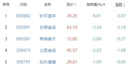 妙可蓝多、甘源食品、青海春天(600381)、立高食品、仙乐健康位列涨幅榜后五位,涨幅分别为-6.81%、-3.34%、-2.80%、-2.03%、-1.99%。