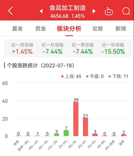 中国经济网北京7月18日讯 今日,食品加工制造板块整体涨幅1.45%,其中,65只股票上涨,11只股票下跌。