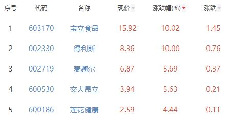 其中,宝立食品、得利斯(002330)、麦趣尔(002719)、交大昂立(600530)、莲花健康位列板块涨幅前五位,涨幅分别为10.02%、10.00%、5.69%、5.63%、4.44%。