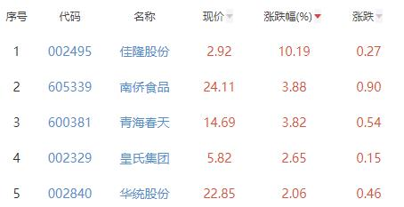 其中,佳隆股份(002495)、南侨食品、青海春天(600381)、皇氏集团(002329)、华统股份(002840)位列板块涨幅前五位,涨幅分别为10.19%、3.88%、3.82%、2.65%、2.06%。