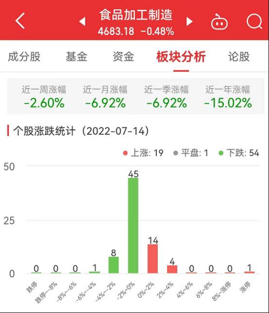 中国经济网北京7月14日讯 今日,食品加工制造板块整体跌幅0.48%,其中,19只股票上涨,1只股票平盘,54只股票下跌。