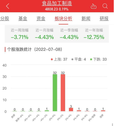 中国经济网北京7月8日讯 今日,食品加工制造板块整体涨幅0.19%,其中37只股票上涨,4只股票平盘,33只股票下跌。