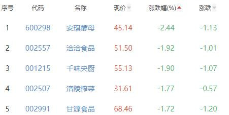 安琪酵母、洽洽食品(002557)、千味央厨、涪陵榨菜(002507)、甘源食品位列涨幅榜后五位,涨幅分别为-2.44%、-1.92%、-1.90%、-1.77%和-1.72%。