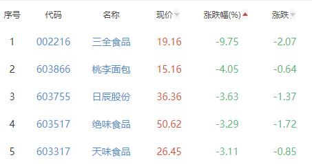三全食品、桃李面包(603866)、日辰股份(603755)、绝味食品(603517)、天味食品(603317)位列涨幅榜后五位,涨幅分别为-9.75%、-4.05%、-3.63%、-3.29%、-3.11%。