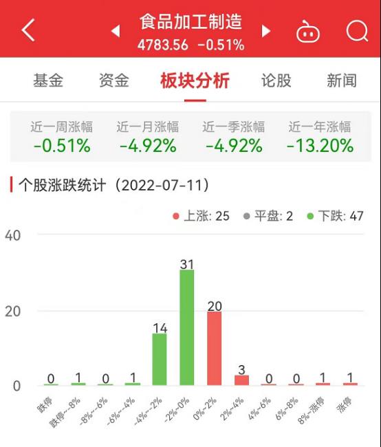中国经济网北京7月11日讯 今日,食品加工制造板块整体跌幅0.51%,其中,25只股票上涨,2只股票平盘,47只股票下跌。
