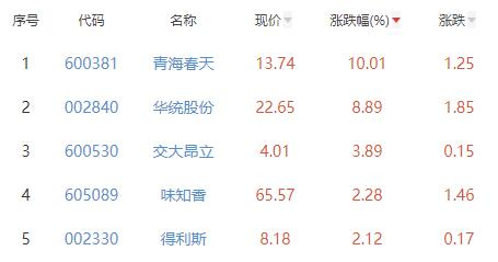 其中,青海春天(600381)、华统股份(002840)、交大昂立(600530)、味知香、得利斯(002330)位列板块涨幅前五位,涨幅分别为10.01%、8.89%、3.89%、2.28%、2.12%。