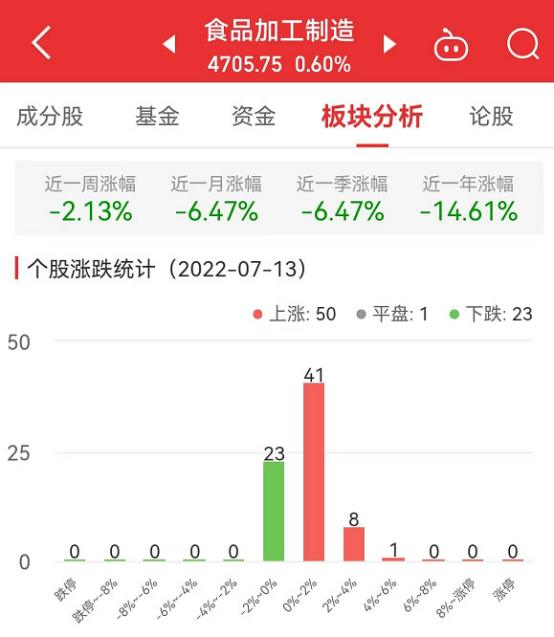 中国经济网北京7月13日讯 今日,食品加工制造板块整体涨幅0.60%,其中,50只股票上涨,1只股票平盘,23只股票下跌。