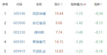 汤臣倍健、安记食品(603696)、得利斯(002330)、青海春天(600381)、天润乳业(600419)位列涨幅榜后五位,涨幅分别为-1.72%、-1.42%、-1.40%、-1.26%、-1.23%。