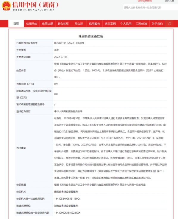 中国经济网北京7月13日讯 近日,信用中国(湖南)公示的行政处罚决定书(隆市监行处﹝2022﹞0378号)显示,隆回县古茗茶饮店因使用超过保质期的原料加工食品,被隆回县市场监督管理局罚款9000元。