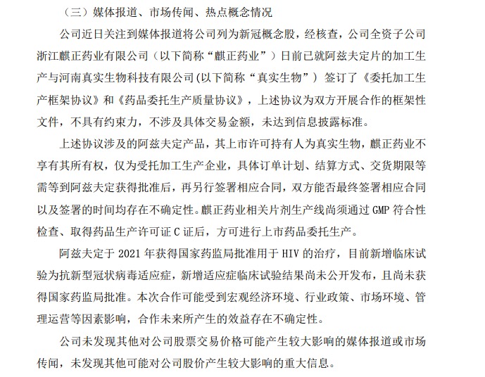 中华网财经4月10讯,今日晚间,奥翔药业(603229)发布股价异常波动公告,公告显示,公司近日关注到媒体报道将公司列为新冠概念股,经核查,公司全资子公司浙江麒正药业有限公司(以下简称“麒正药业”)日前已就阿兹夫定片的加工生产与河南真实生物科技有限公司(以下简称“真实生物”)签订了《委托加工生产框架协议》和《药品委托生产质量协议》,上述协议为双方开展合作的框架性文件,不具有约束力,不涉及具体交易金额,未达到信息披露标准。
