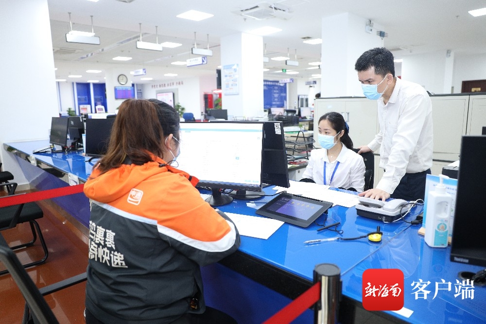 快递员在海南省社会保险服务中心经办大厅柜台完成了基层快递网点优先参加工伤保险业务申报。