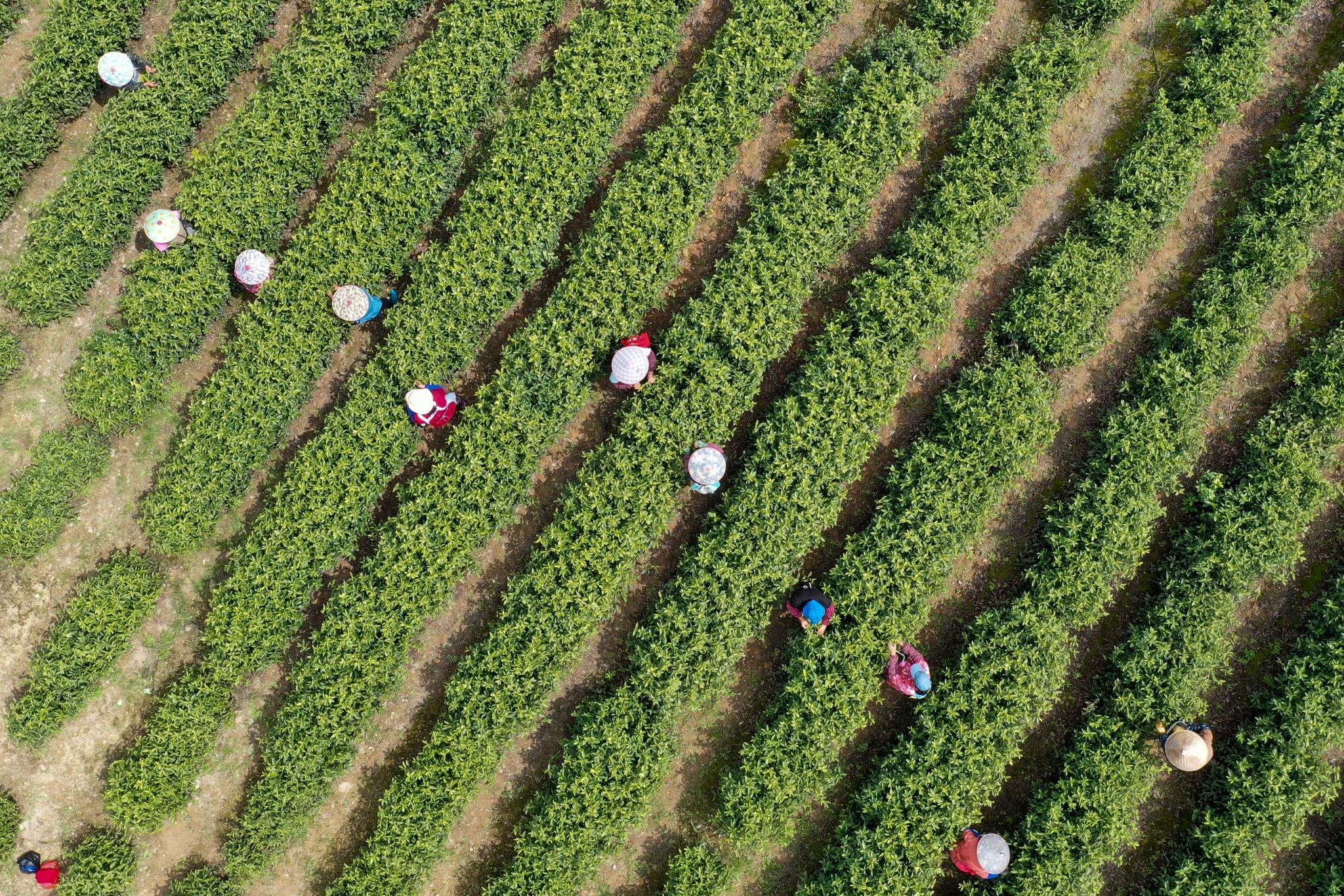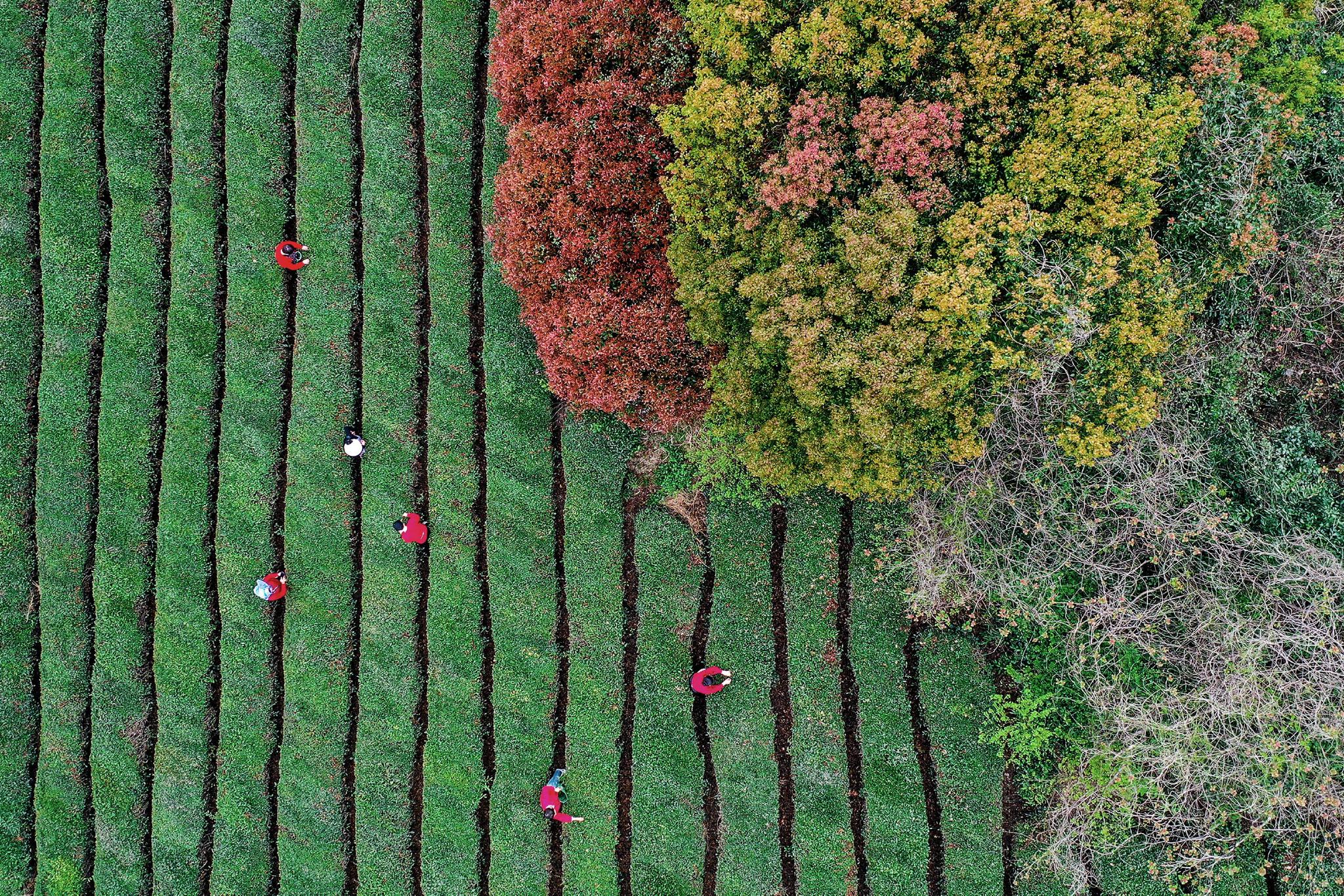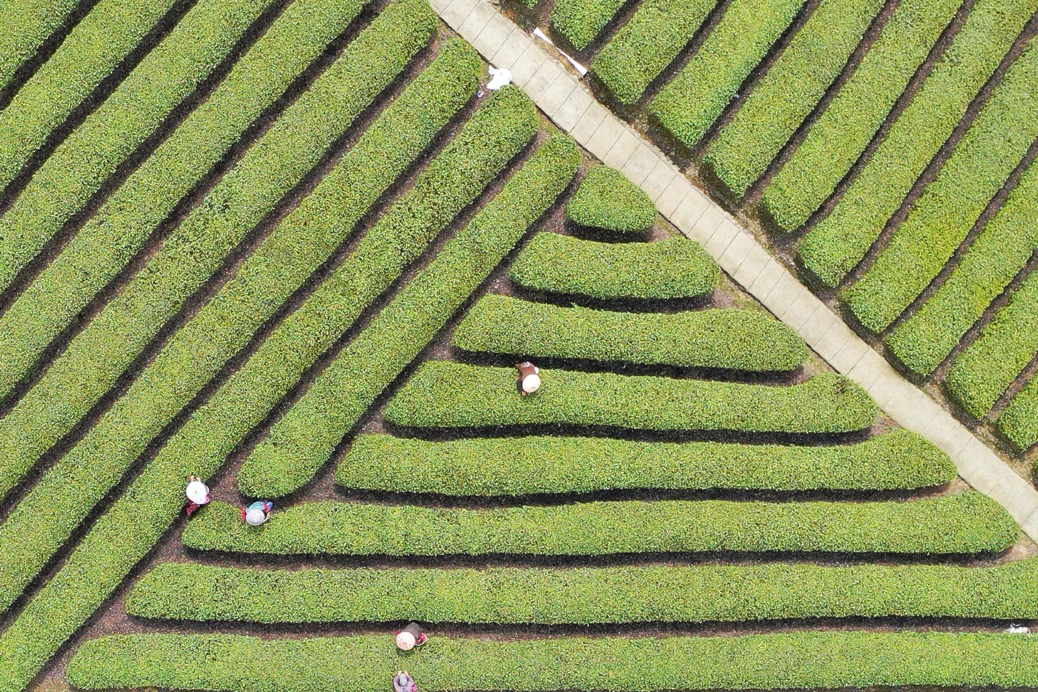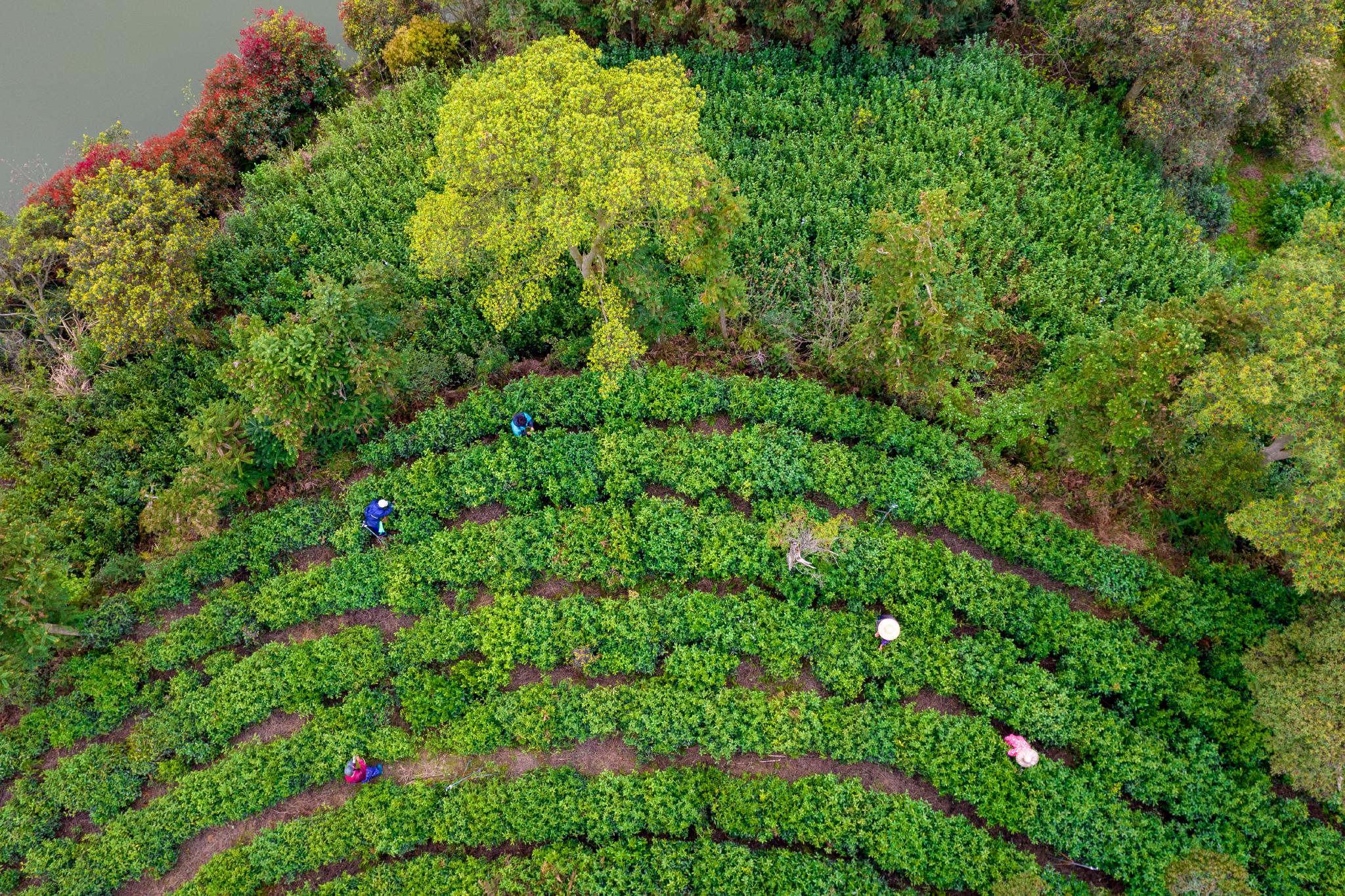 3月30日,浙江省宁波市鄞州区东吴镇的茶农在采摘明前茶(无人机照片)。新华社发(胡学军摄)