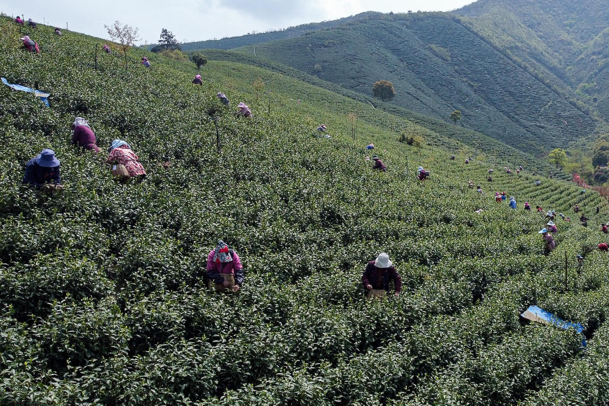 3月30日,茶农在浙江省义乌市道人峰茶园采摘明前茶。新华社发(龚献明摄)