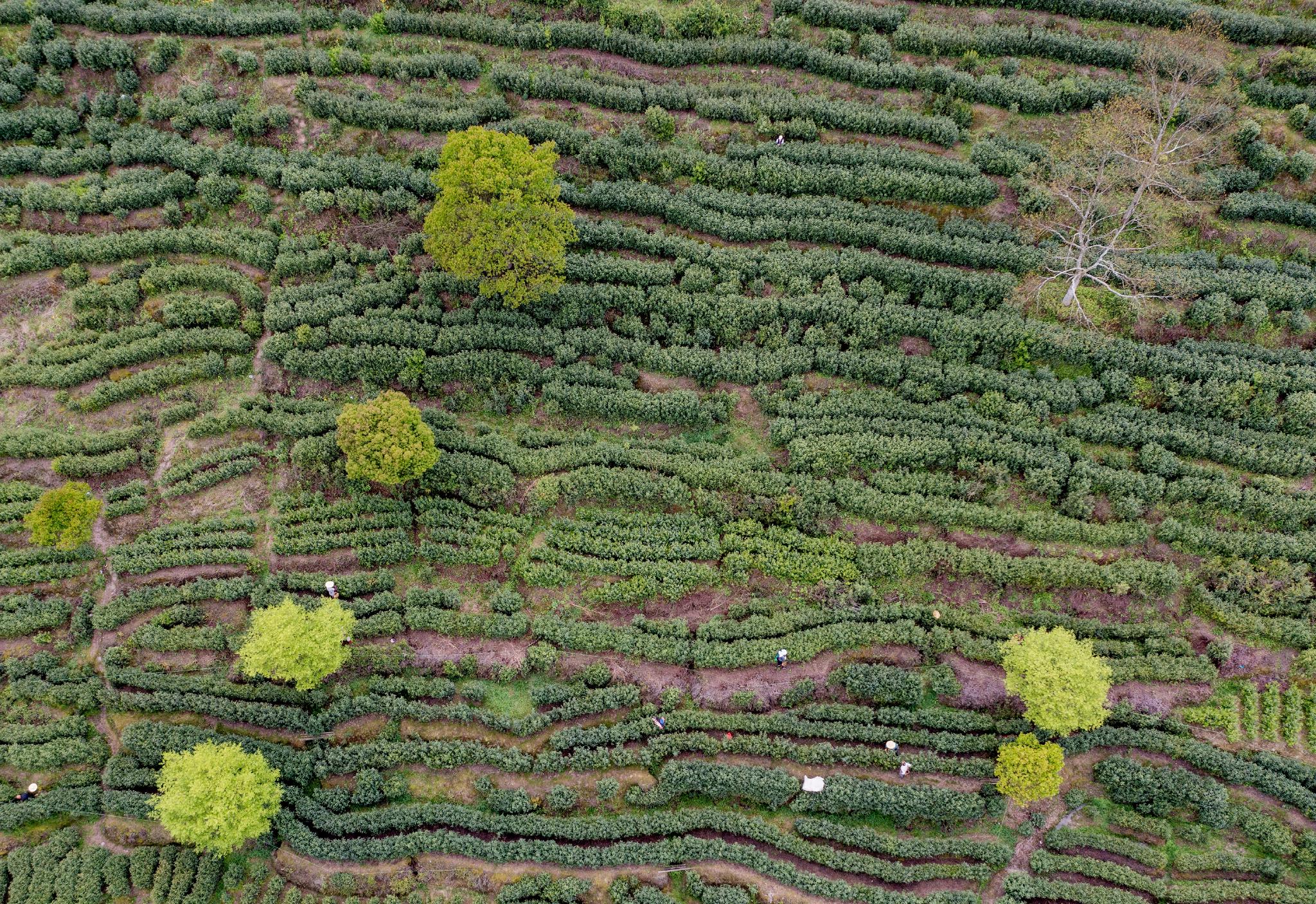 3月30日,茶农在浙江省景宁畲族自治县鹤溪街道敕木山村生态茶园采摘明前茶(无人机照片)。新华社发(李肃人摄)