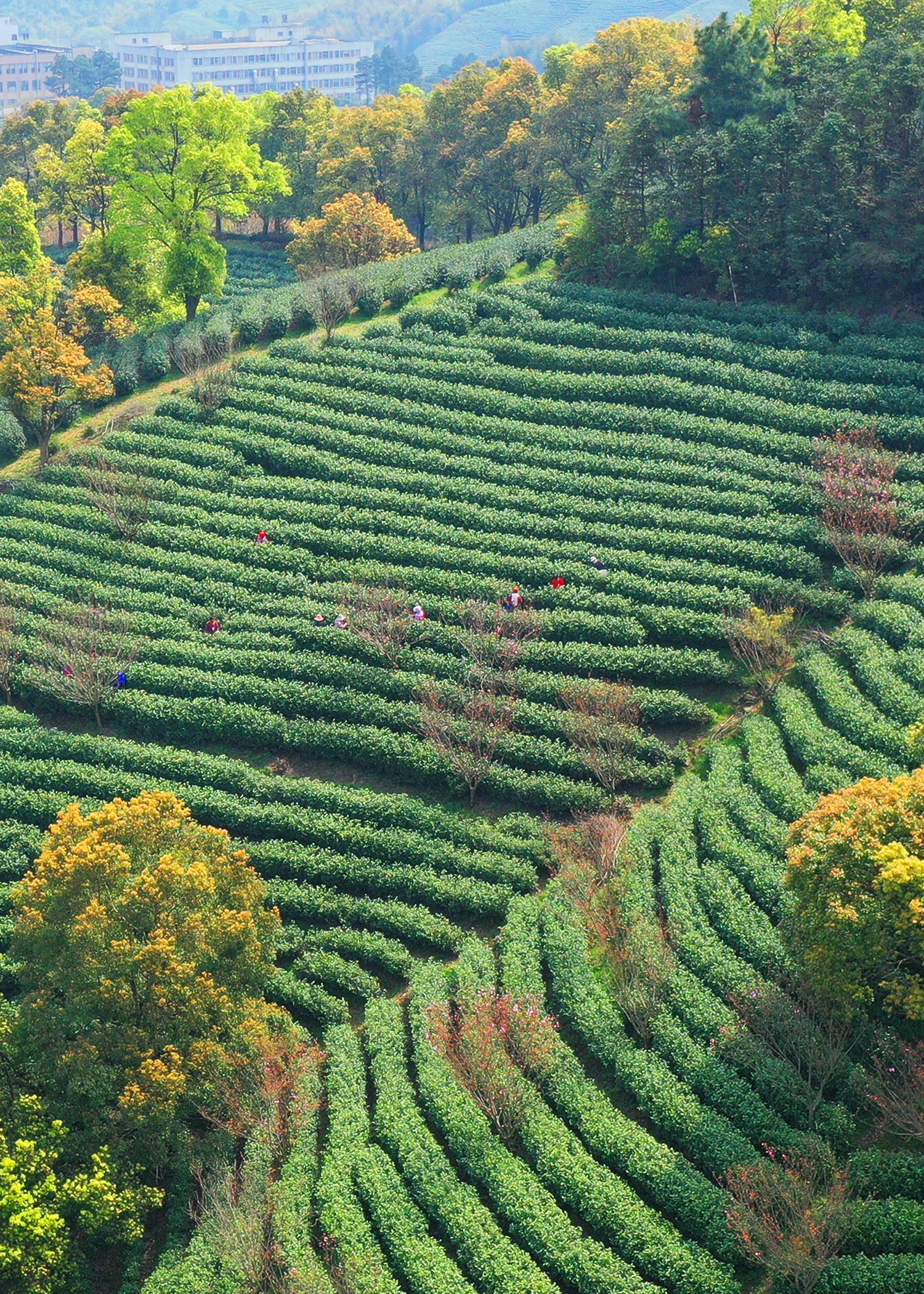 3月30日,采茶工在杭州西湖区的茶园里采摘明前茶(无人机照片)。新华社发(龙巍摄)